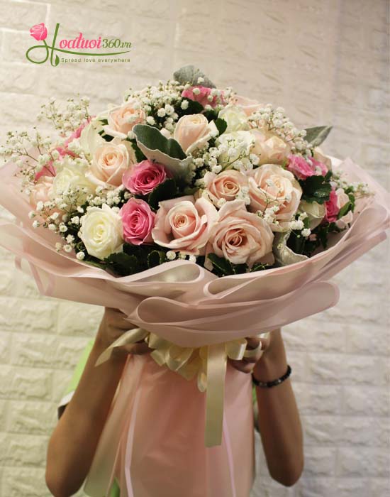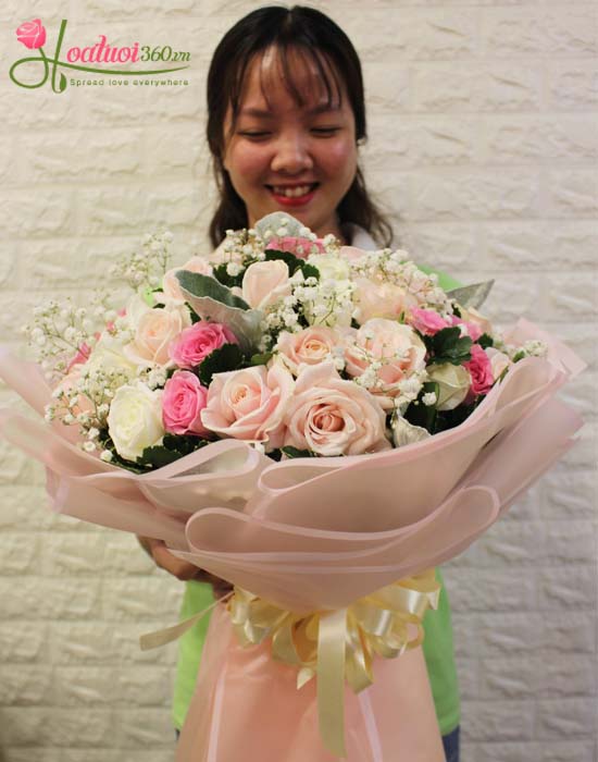 Bó hoa đẹp- nụ cười thiên thần nhẹ nhàng mà lãng mạn với tone hồng làm say đắm bao nhiêu cô gái. Có sự góp mặt của hoa hồng da, hoa hồng dâu, hoa hồng trắng và hoa baby. Rất thích hợp cho món quà sinh nhật, món quà tặng bạn gái, vợ nhân ngày kỉ niệm yêu nhau, Valentine day , mẹ. tặng bạn bè đồng nghiệp vào các dịp lễ trong năm,....