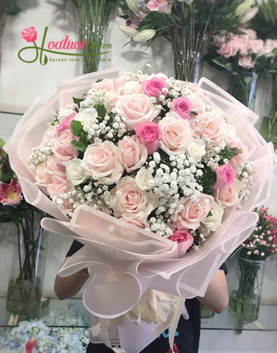 Tình yêu là một loạt các cảm xúc, trạng thái tâm lí của con người mà đôi khi rất khó diễn tả thành lời. Bạn không biết nói sao cho đối phương hiểu được cảm xúc nhớ nhung, buồn, vui, ... ngay lúc này của mình. Vậy một bó hoa hồng tuyệt đẹp sẽ rất hữu ích trong việc thay lời bạn muốn nói tới đối phương đấy. Sự kết hợp giữa hoa hồng kem dịu nhẹ, hoa hồng trắng tượng trưng cho sự ngây thơ, duyên dáng và sự cảm thông. Hồng trắng không chỉ biểu tượng cho một tình yêu thuần khiết, cao thượng mà mặt khác, nó còn là loài hoa dành để bày tỏ lời xin lỗi đến người yêu nếu chẳng may bạn có mắc lỗi lầm. Hoa hồng dâu là biểu tượng của tình yêu và lòng biết ơn. Thích hợp cho hoa chúc mừng sinh nhật, hoa chúc mừng nhân dịp thăng chức, hoa chúc mừng nhận công tác mới, hoa chúc mừng ngày cưới, hoa chúc mừng ngày thành lập, hoa chúc mừng ngày đón nhận huân, huy trương, hoa chúc mừng ngày gặp mặt, hoa chúc mừng ngày bảo vệ luận án, hoa chúc mừng lễ tốt nghiệp, hoa chúc mừng tân gia.
