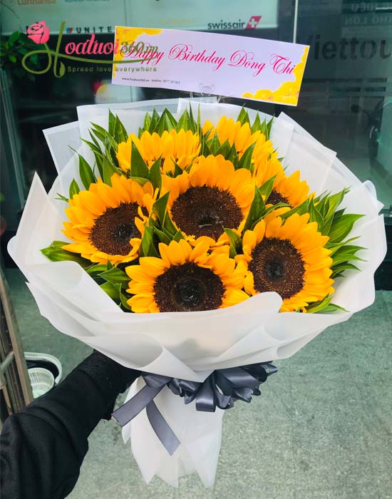 Vẻ đẹp rạng rỡ và tràn đầy sức sống của những đóa hoa hướng dương là điểm nhấn chính của bó hoa chúc mừng này. Thiết kế nổi bật trên nền giấy gói trắng tinh khôi, mang ý nghĩa về một khởi đầu mới, một tương lai tươi sáng và luôn hướng về phía trước.
