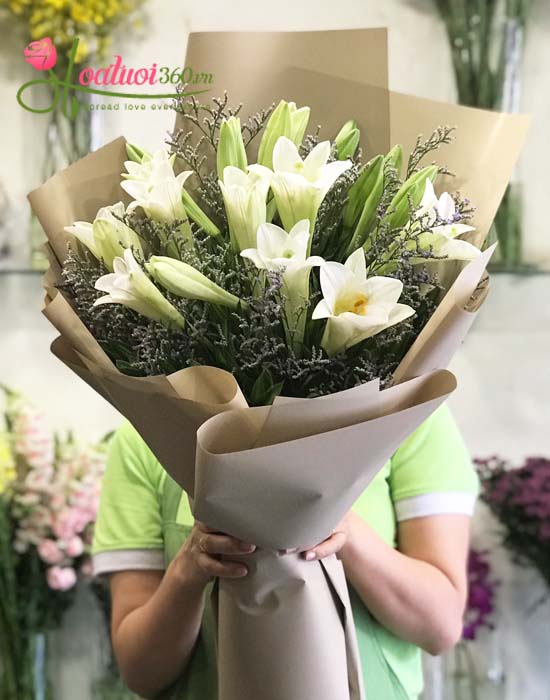 Vẻ đẹp trang trọng và thuần khiết của những đóa hoa loa kèn trắng là điểm nhấn chính của bó hoa này. Thiết kế được gói tối giản trong giấy kraft, tôn lên nét thanh tao của hoa, mang ý nghĩa về sự kính trọng, lòng thành kính và sự khởi đầu mới.