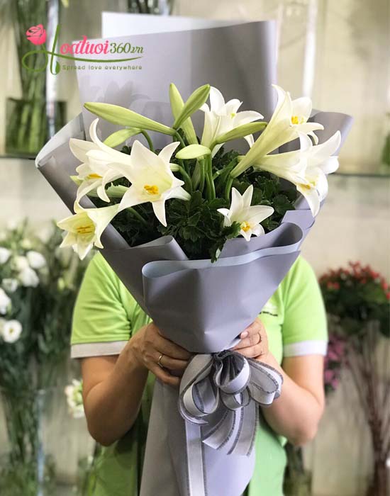 Mười đóa loa kèn trắng muốt, biểu tượng của sự thanh cao và hạnh phúc, được bao bọc trang nhã trong lớp giấy gói xám cao cấp. Đây là lựa chọn hoàn hảo để gửi gắm lời chúc mừng thành công, lời cảm ơn sâu sắc hay đơn giản là mang lại niềm vui cho người nhận trong mọi dịp.