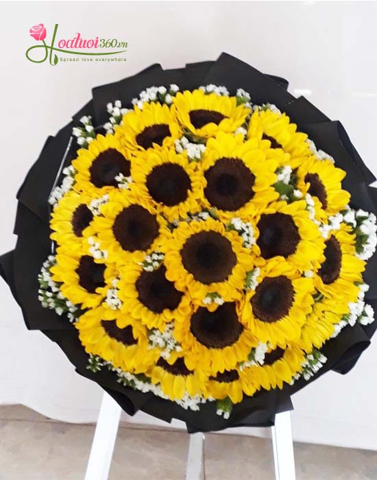 Bó hoa là sự kết hợp đầy ấn tượng giữa 25 đóa hướng dương vàng rực và gam màu đen của giấy gói Hàn Quốc cao cấp. Những bông hoa mặt trời kiêu hãnh, xen kẽ là cành baby trắng mềm mại, tạo nên một tổng thể vừa mạnh mẽ vừa tinh tế.