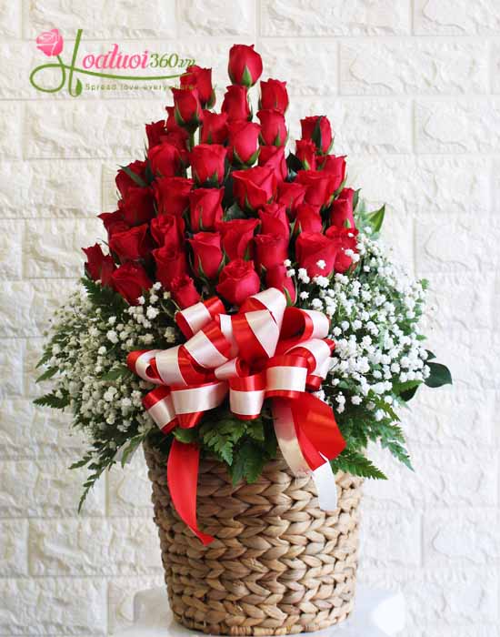 Những bông hồng đỏ nở rộ, được sắp xếp khéo léo khiến mẫu hoa cắm giỏ trông rực rỡ và lãng mạn hẳn. Xen giữa là những nhánh baby trắng li ti, mang đến cảm giác nhẹ nhàng, ngọt ngào.