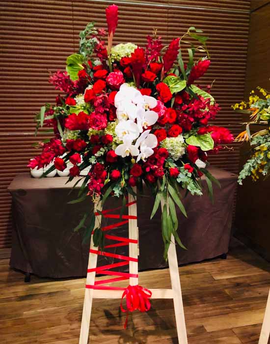 Giữa muôn vàn đóa hồng đỏ rực, những cành hồ điệp trắng tinh khôi vươn lên đầy kiêu hãnh, tạo điểm nhấn sang trọng cho kệ hoa chúc mừng. Món quà là lời chúc cho một khởi đầu mới thuận lợi, thành công vang dội, là món quà đẳng cấp và ý nghĩa gửi đến đối tác, doanh nghiệp trong ngày khai trương.