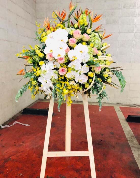 Gửi gắm lời chúc "Khai trương hồng phát" qua sắc vàng của hồng và lan vũ nữ, hòa quyện cùng lan hồ điệp trắng và thiên điểu. Kệ hoa gửi gắm thông điệp về sự sung túc, kinh doanh thuận buồm xuôi gió, là lựa chọn hoàn hảo để chúc mừng khai trương cửa hàng, công ty.