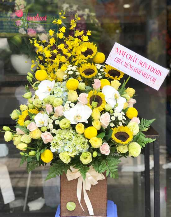 Mang sắc vàng rực rỡ của ánh nắng và hy vọng, hộp hoa chúc mừng thể hiện sự hy vọng và cầu chúc cho người nhận luôn hạnh phúc, thành công. Những đóa hướng dương rạng rỡ, lan Hồ Điệp trắng tinh khôi kết hợp cùng cẩm tú cầu xanh dịu và hồng pastel, tất cả được sắp đặt khéo léo trong hộp nâu nhã nhặn thắt nơ kem, tạo nên một tổng thể hài hòa và cuốn hút.