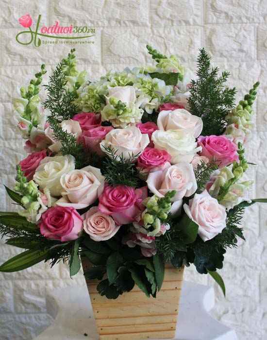Mẫu hoa cắm hộp nhỏ xinh khoác lên mình sắc hồng dịu dàng, mang đến cảm giác tươi vui và ngọt ngào. Món quà này là lời chúc sinh nhật hạnh phúc, may mắn và trọn vẹn niềm vui.