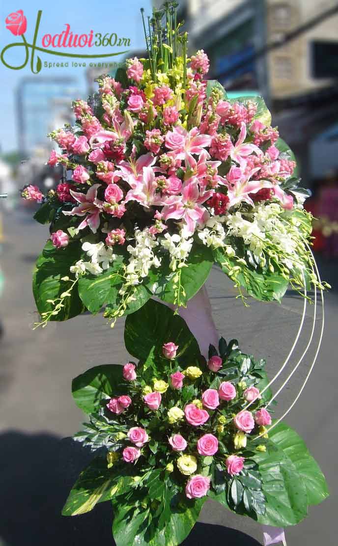 Kệ hoa khai trương là sự hòa quyện rực rỡ giữa hồng môn, hoa hồng, lan vũ nữ, hoa ly và mõm sói, điểm xuyết cùng hoa lá phụ kiện tinh tế. Tổng thể mang sắc thái tươi sáng, mạnh mẽ, gửi gắm lời chúc thành công trên mọi chặng đường, làm ăn phát đạt và vững bước tiến xa. Đây là lựa chọn hoàn hảo để gửi tặng trong ngày khai trương hay các dịp chúc mừng trọng đại.