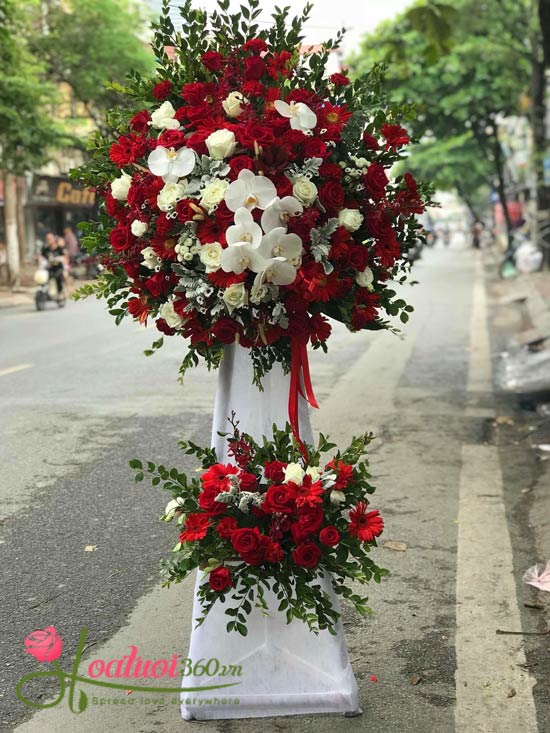 Kệ hoa chúc mừng được phối cắm từ hồng trắng, hồng đỏ, đồng tiền đỏ và lan hồ điệp, tạo nên tổng thể vừa rực rỡ vừa trang nhã. Sắc đỏ – trắng hòa quyện tượng trưng cho niềm vui, sự đoàn kết và thành công rực rỡ. Với thiết kế sang trọng cùng phụ kiện hoa lá tinh tế, đây là món quà ý nghĩa mang đến không khí ấm áp, gắn kết trong buổi tiệc tất niên của công ty.