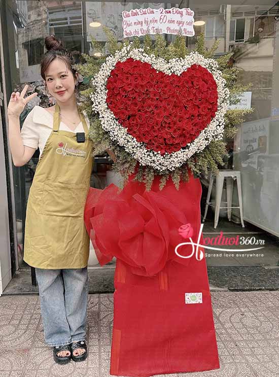 Hoa kỷ niệm ngày cưới được thiết kế thành kệ hoa trái tim ấn tượng từ hàng trăm đóa hồng đỏ nồng nàn. Tác phẩm thể hiện một tình yêu to lớn, mãnh liệt và chung thủy. Đây là món quà bất ngờ, hoành tráng để tặng vợ trong dịp kỷ niệm ngày cưới vàng, cưới bạc.