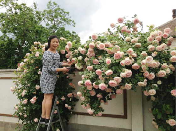 Trong gia đình, mọi người sẵn sàng hỗ trợ chị chăm sóc cây nhưng chị vẫn thích làm một mình. Với hoa hồng, loại hoa mà chị yêu thích, chị thường tự mình bắc thang cắt tỉa. Dàn hoa hồng rực rỡ của chị được trồng từ năm 2006-2007.